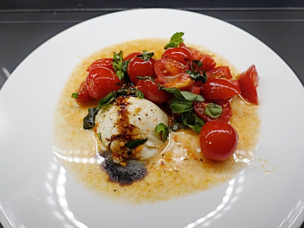 Decorate some cherry tomato halves around the pile with a dash of balsamico creme.