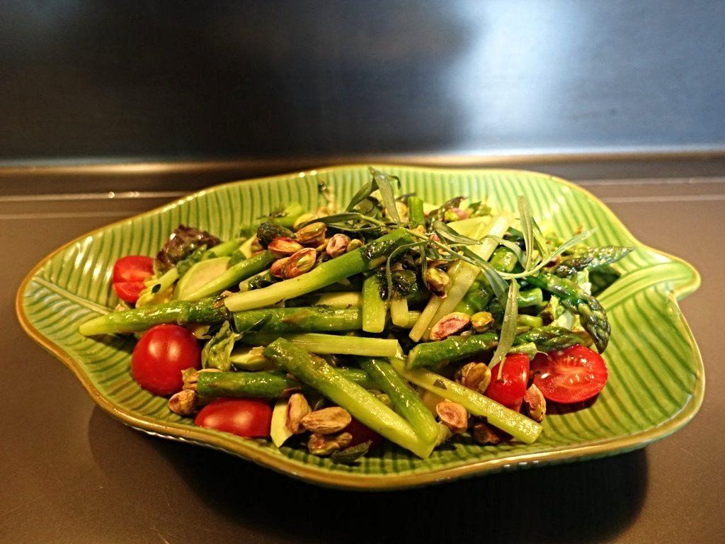 Fry asparagus with some olive oil in a big pan for a few minutes, add salt and tomatoes, fry for another 2 minutes, add estragon and basil. Add olive oil and balsamico and sprinkle with salted pistacchios.
