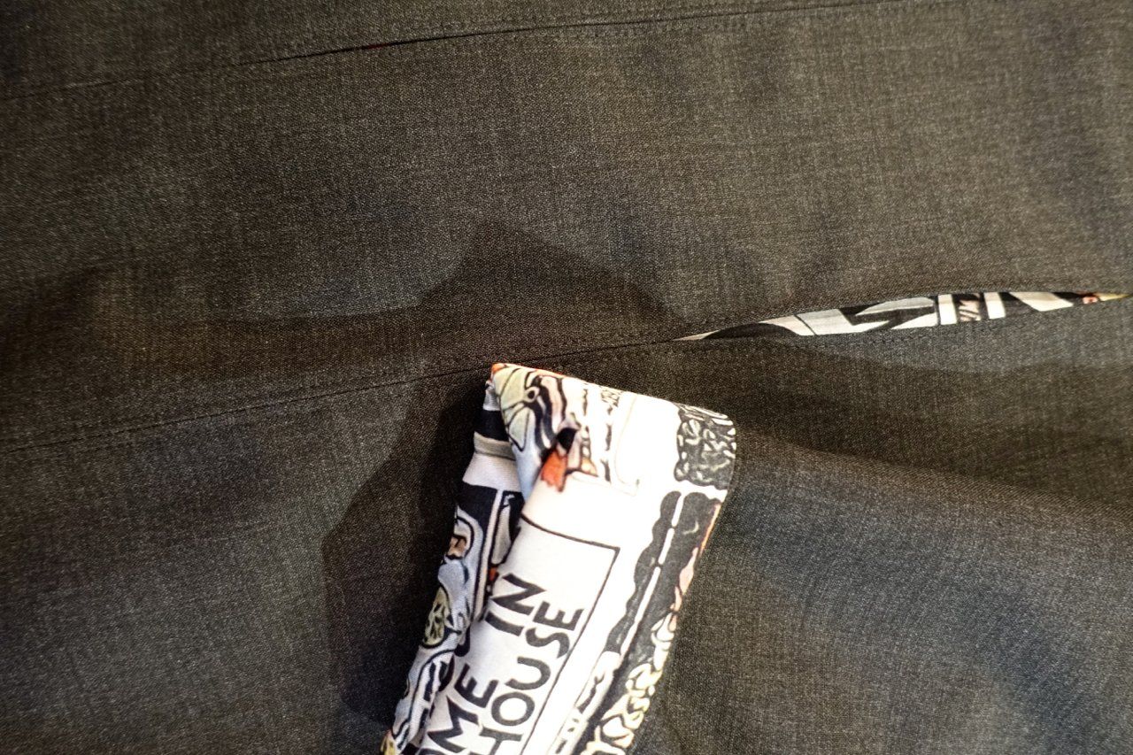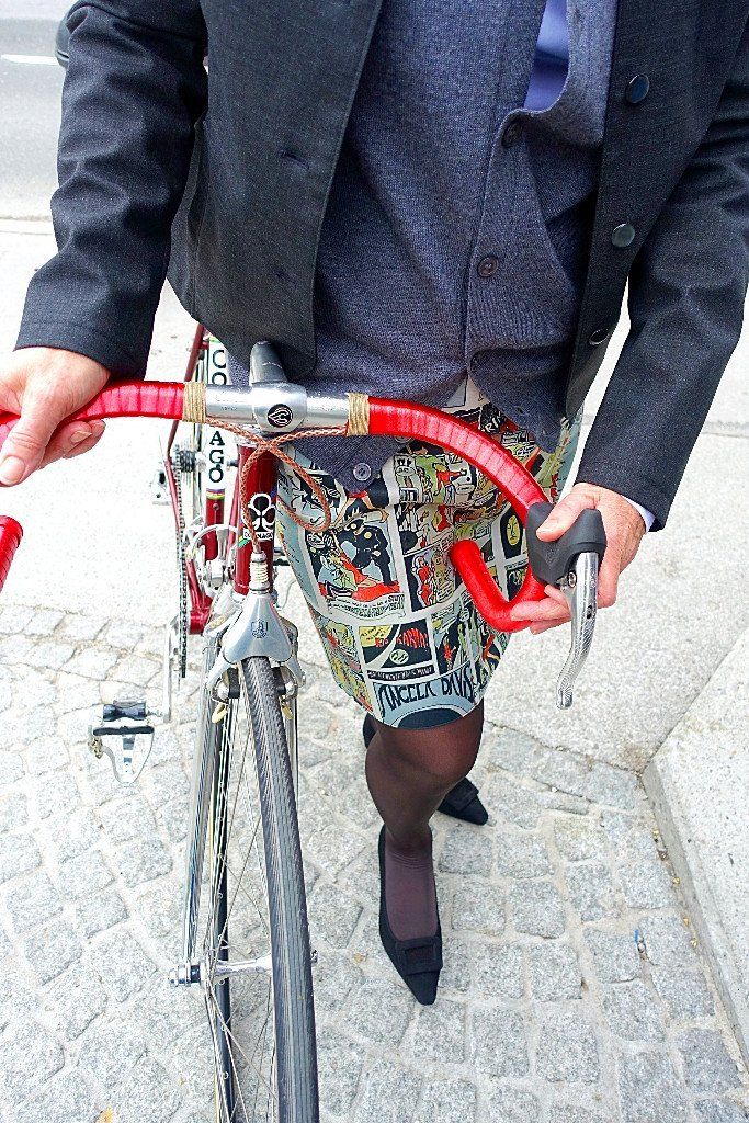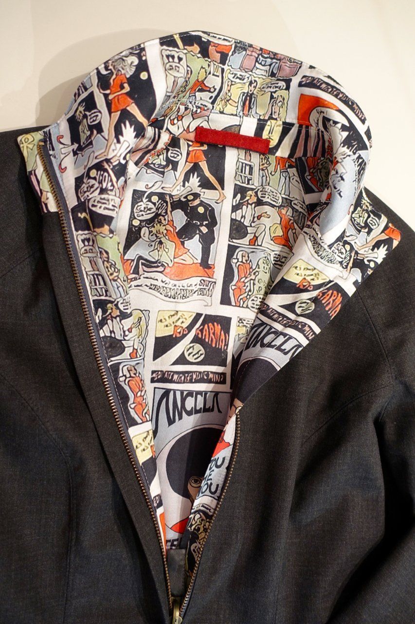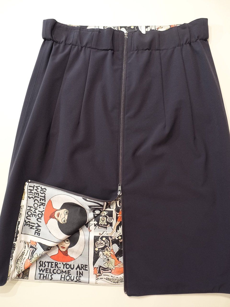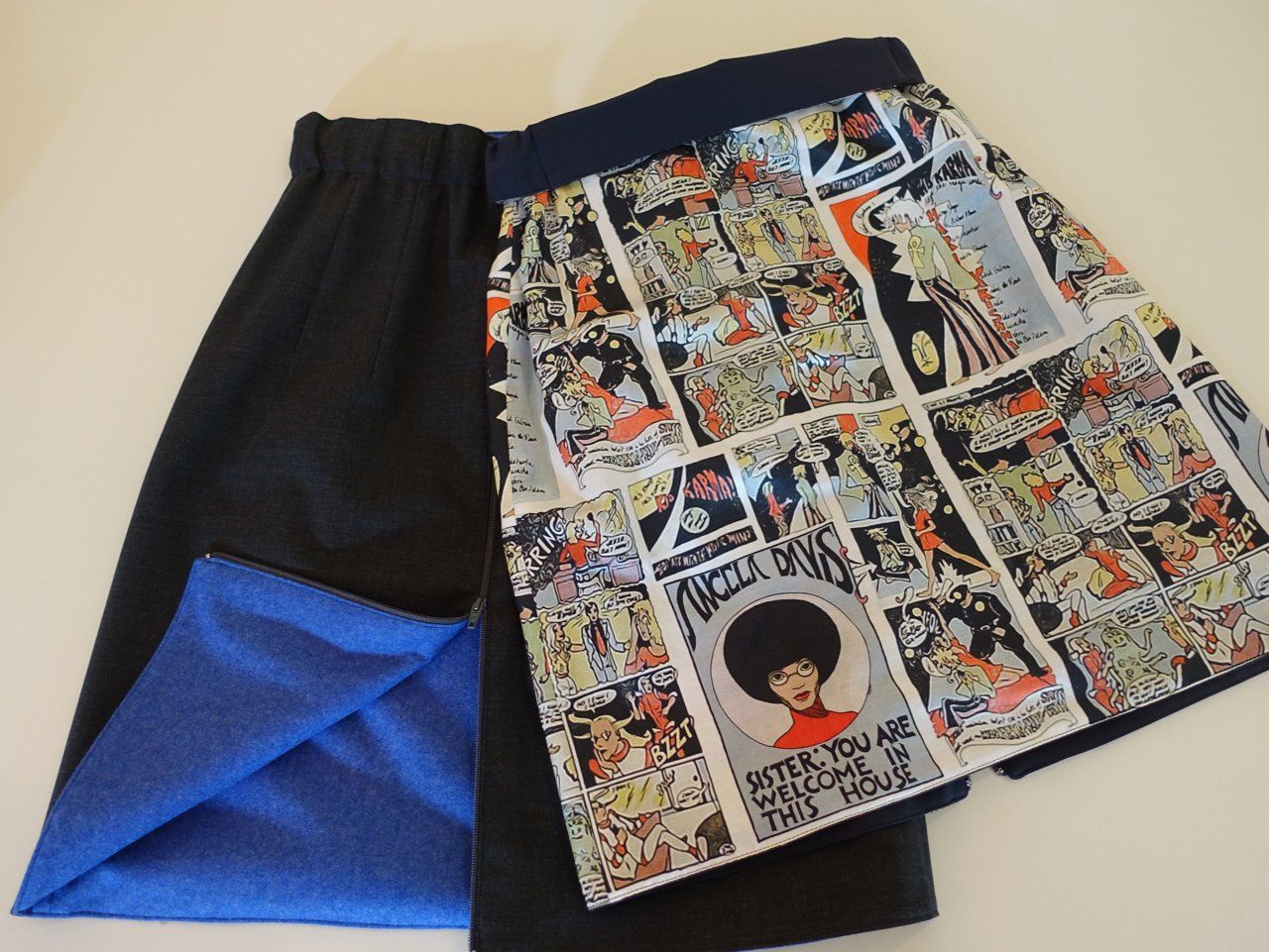 Two skirts in one: Italian comic print (cotton + silk) and Swiss high tech material (waterproof) = two different looks.
