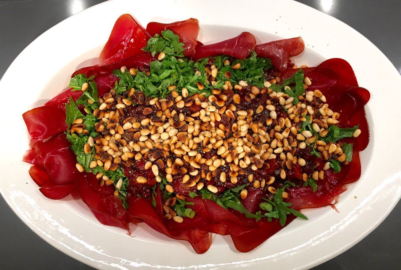 Smoked Venison with Rocket Salad and Roasted Pine Nuts: